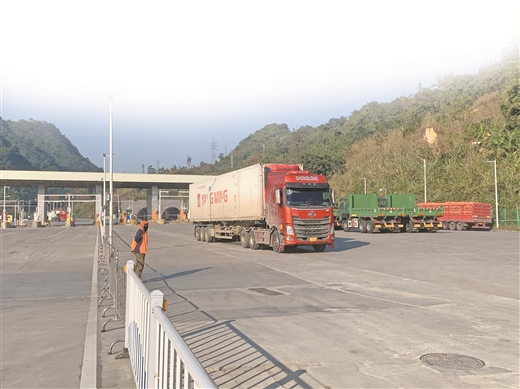 满载货物的重卡从中越浦寨—新清货运通道出入境。