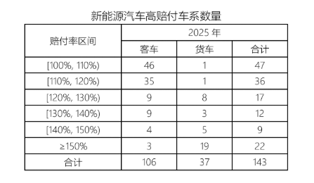 数据显示,2025年,我国保险业承保新能源汽车4358万辆(其中客车4181万辆,货车177万辆),比上年增加1248万辆,增长40.1%;保费收入1900亿元,提供风险保障金额159万亿元;承保亏损56亿元,同比减亏1亿元;综合成本率同比下降1.3个百分点。新能源汽车规模车系数量429个,其中客车370个,货车59个。 相关业内人士表示,当前,保险业持续完善新能源车险定价能力、降低维修成本,2025年在承保覆盖面持续扩大的情况下,亏损进一步收窄,行业整体呈现出向好的发展趋势。与此同时,行业也在积极服务“两司”(货车司机、网约车司机),通过完善“车险好投保”平台等举措履行社会责任。 2025年赔付率超过100%(尚未考虑财险公司日常经营管理费用成本)的高赔付车系有143个,较上年增加6个,其中客车106个,货车37个。 其中,赔付率在100%—110%之间的高赔付车系有47个,含客车46个、货车1个;赔付率在110%—120%之间的有36个,含客车35个、货车1个;赔付率在120%—130%之间的有17个,含客车9个、货车8个;赔付率在130%—140%之间的有12个,含客车9个、货车3个;赔付率高于150%的有22个,客车3个、货车19个。 为何新能源车险阶段性出现赔付率高的情况?上述业内人士表示,主要还是由于出险率较高。新能源汽车凭借低使用能源成本优势成为营运类车辆的优先选择;此外,一些车型在家用状态下,其赔付率本属于正常水平,但这些车型中有不少属于网约车,导致整体赔付率高于100%。 中国人保党委委员、人保财险党委书记张道明在中国人保2025年业绩发布会上表示,整体来看,新能源车险仍面临三大挑战:一是新能源车辆出险率高,大幅高于燃油车;二是社会化维修渠道不足,车辆维修成本相对较高;三是人伤案件占比和赔偿标准均呈现上升趋势,案均赔款上涨,这些都导致新能源车险赔付压力处于高位。 费用率将稳中向好 在车险“报行合一”的常态化监管下,行业费用竞争回归理性,而新能源车险的规模扩张与赔付改善正成为决定车险盈利水平的核心因素。 张道明表示,目前,新能源车险已经出现了一些积极的因素:一是受旧车占比提升、驾驶行为习惯改善、辅助驾驶技术进步等多重因素影响,新能源车出险率已经呈现出下降趋势。二是配置自动紧急制动系统AEB的货车从数据上看赔付风险较未配备的货车低7%,主要体现在案均赔款降低。根据国家标准,预计2026年7月1日起,重型营运货车新车要求强制配备AEB;2028年1月1日起,轻型货车新车要求强制配备AEB,这对新能源货车赔付风险的改善将是重要利好。三是国内新能源车型风险分级制度正在筹备建设中,其推出必将推动车企更加关注并不断提升车型的安全性与维修的经济性,从而最终降低车辆维修成本,使广大新能源车消费者受益。 “从费用率方面看,2026年监管将进一步巩固‘报行合一’、强化‘三项机制’、整治违规行为、规范市场秩序,费用率将稳中向好。综合来看,预计2026年新能源车险综合成本率将进一步改善,盈利水平将进一步提升。”张道明补充道。 车险是汽车产业链的重要一环。当前新能源车险出现高赔付的阶段性特征,反映了新能源汽车产业链在前后端还不协调,需要保险业和汽车产业协同联动解决。 精算师协会与中国银保信表示,有关高赔付率车系的具体情况将通过适当方式反馈给相关汽车生产企业,推动其完善车辆安全性与维修经济性设计,合力降低车辆全生命周期使用成本。 下一步,精算师协会与中国银保信将继续推动跨行业沟通与数据共享,持续跟踪分析新能源车险有关赔付情况,及时回应社会关切,提高新能源车险保障能力和服务水平,助力新能源汽车产业高质量发展。
